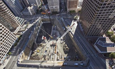 So just how massive is this concrete foundation? The total concrete pour volume is estimated at 21,200 Cubic Yards (CY). CalPortland, the concrete supplier, is expected to utilize 208 concrete trucks to each make 10 deliveries from one of nine batch plants. Turner will mobilize 19 pumps which will dispense the concrete through 13 different hoses into the pit. The entire pour process is expected to take 30 hours. The pit is reinforced with nearly 7 million pounds of reinforcing steel and the total estimated weight of the concrete will be 84 million pounds.